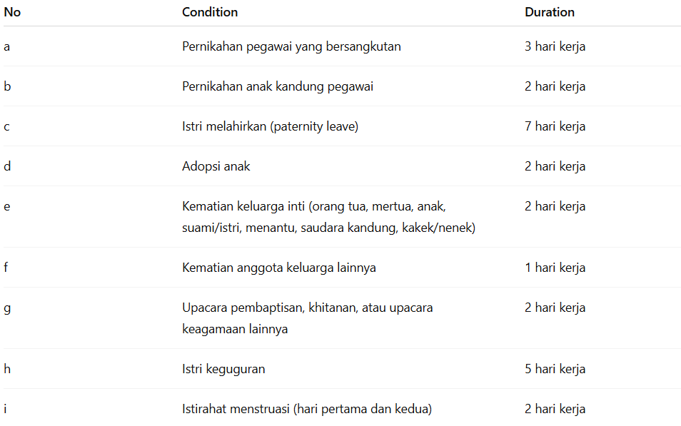The following types of leave are available to employees, in accordance with company policy and Indonesian labor regulations: